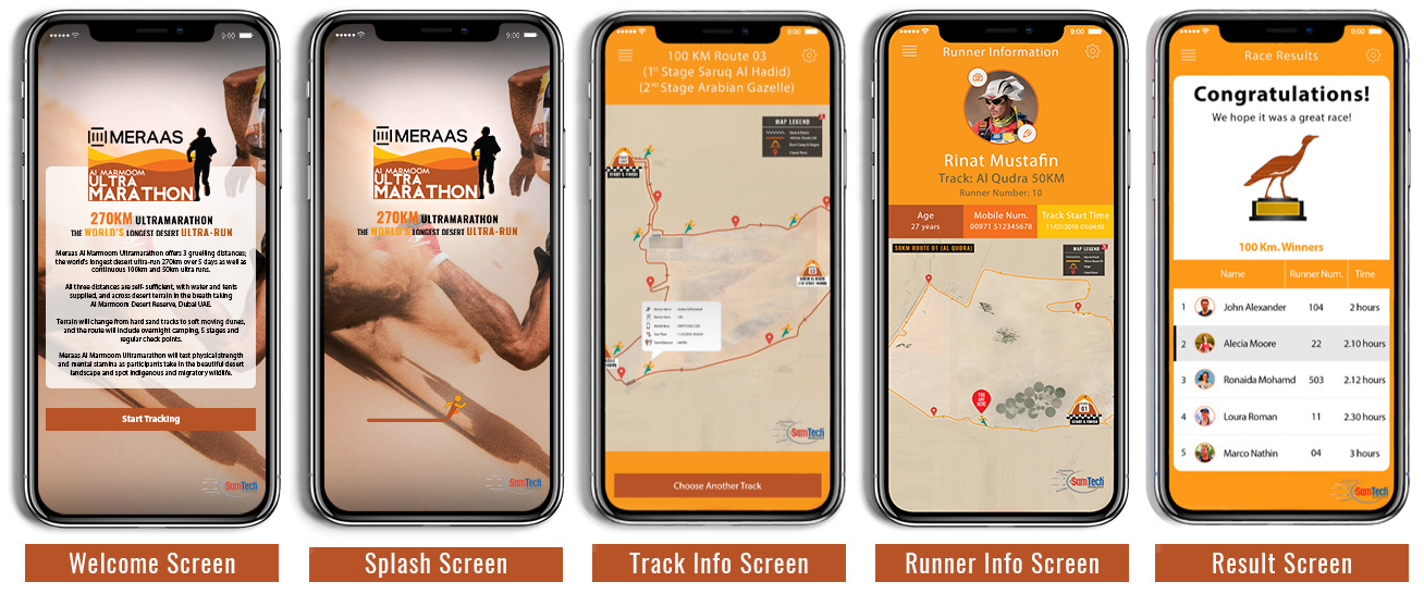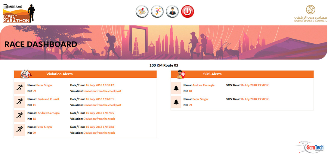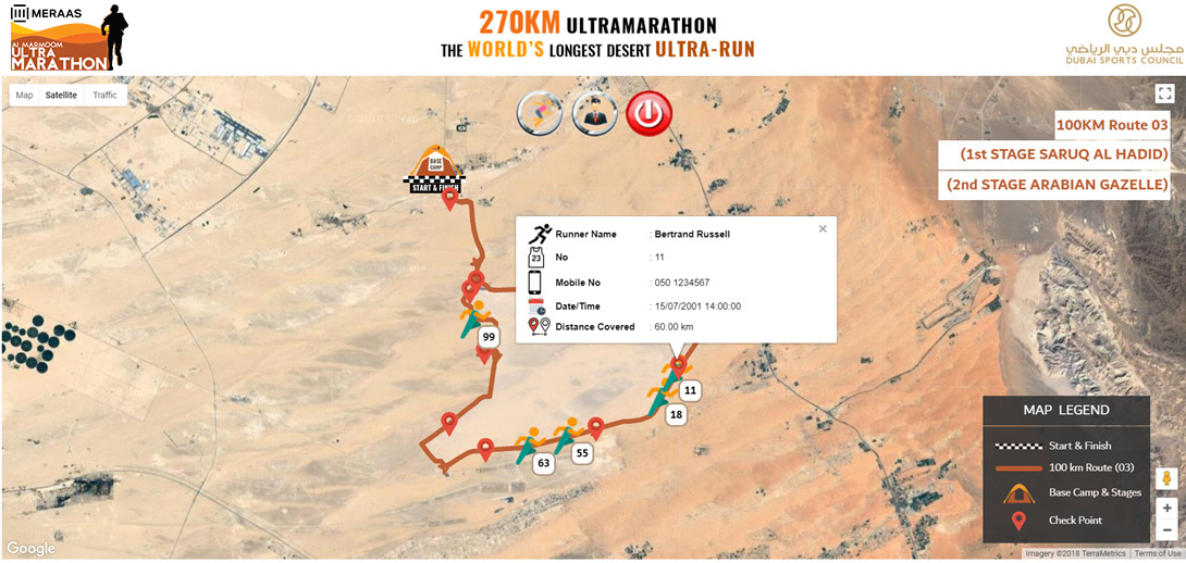 SamTech the official Technology Partner for the Meraas Al Marmoom Ultramarathon, is providing state-of-the-art technology to track & time the runners and also providing smart applications for the participants, organizers and general public. The tracking devices, worn by each participant, provide an SOS button that will alert first responders in case of emergencies. The race organizers will also be notified immediately if runners deviate from the route.